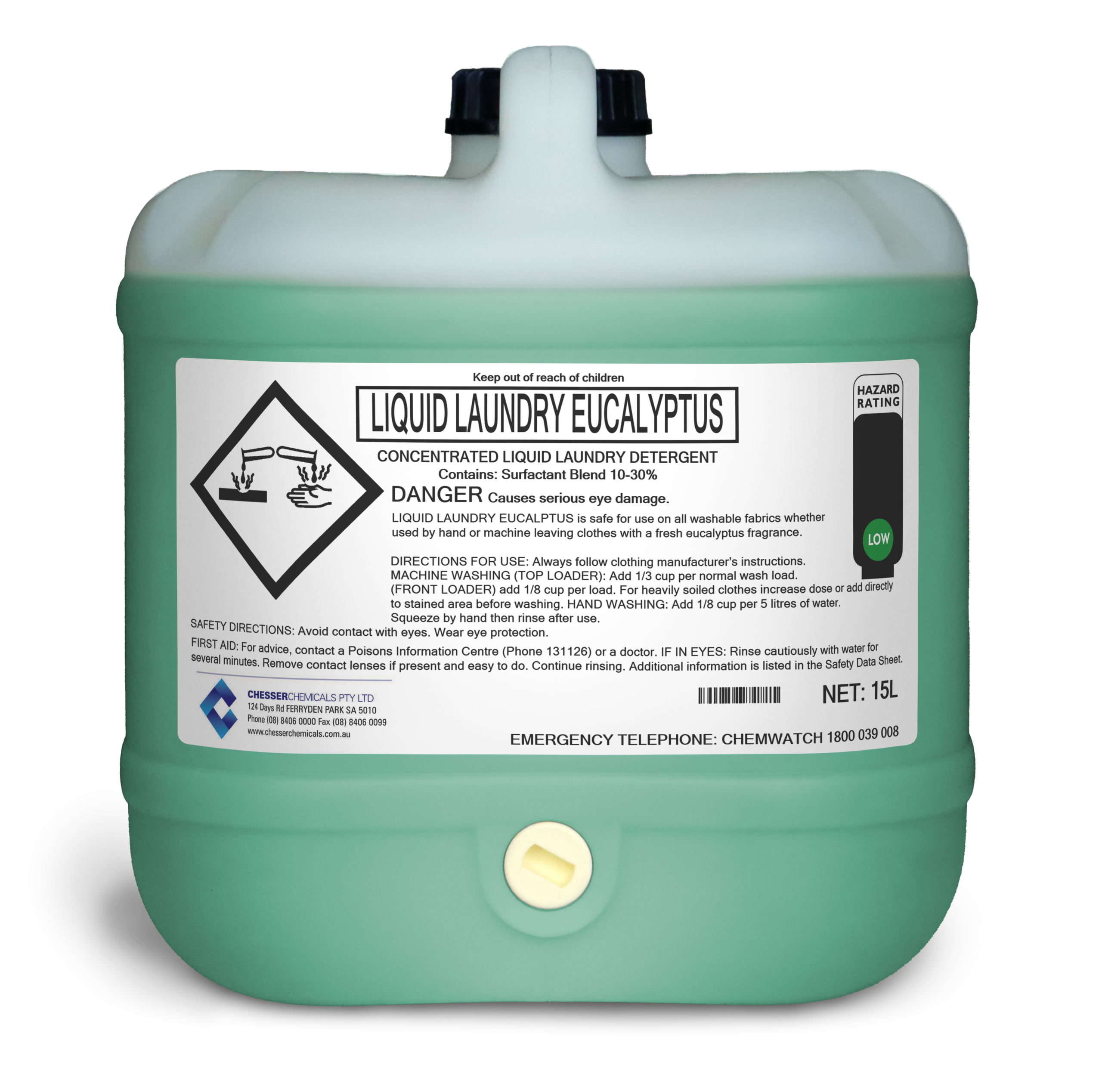 A concentrated liquid laundry detergent suitable for all washable fabrics whether by hand or machine leaving behind a eucalyptus scent.