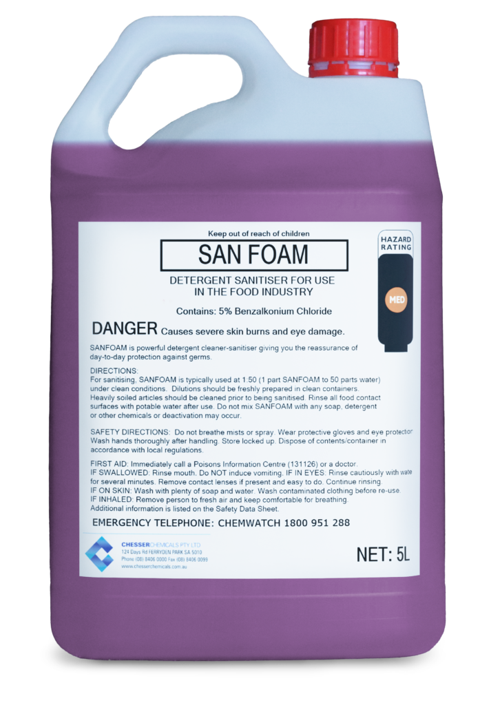 A concentrated, alkaline quaternary ammonium base sanitiser/cleaner for the food processing industry, which exhibits high foaming characteristics. Sanfoam can be used through foaming equipment and produces a stable foam that clings to vertical surfaces.